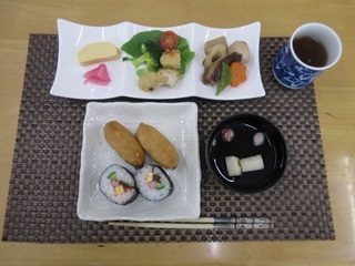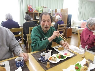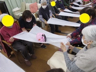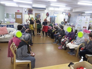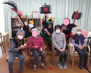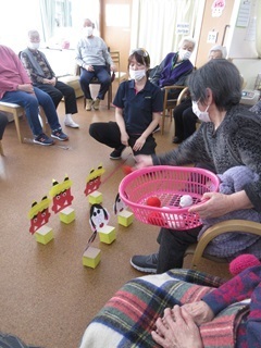 それぞれ鬼と福の箱にお手玉を投げ入れてもらい